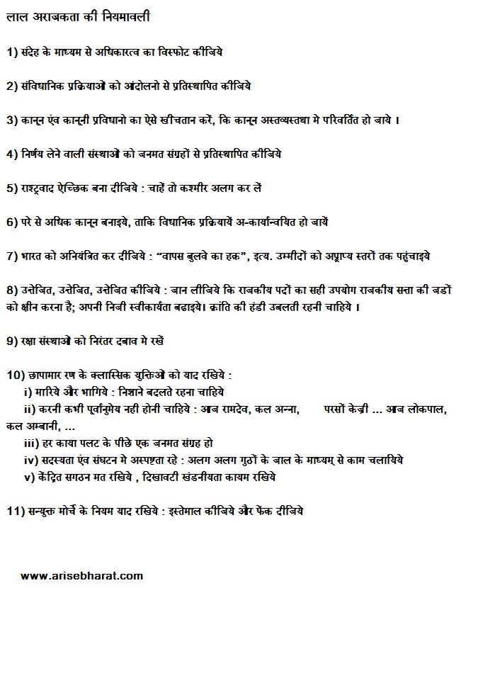 8) उत्तेजित, उत्तेजित, उत्तेजित कीजिये : जान लीजिये कि राजकीय पदों का सही उपयोग राजकीय सत्ता की जडों को क्षीन करना है; अपनी निजी स्वीकार्यता बढाइये। क्रांति की हंडी उबलती रहनी चाहिये ।