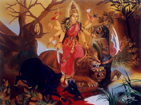 The second story is of Devi Durga/Mahishasura Mardini. The powerful Asura King Mahishasura defeats the divine armies of Indra and having lost swarga to the enemies Indra and other Devatas approach the primal Gods Vishnu and Siva. Then the three primal gods (trimurty) with their will give their energies unto a common form. All the devatas contribute their powers to the form and the collective energy form thus resulted, takes the form of the primal energy/Para Sakti Durga. Exceedingly beautiful, radiant, powerful, possessing all forms of weapons and riding a lion, the Mother is worshiped by the Devatas and then assures them of success.