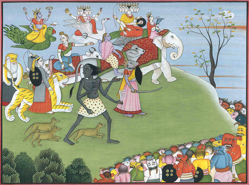 Having lost dhUmrAksha, canDa and munDa set out with their armies to fight Devi. In the terrible encounter Devi deputes Her fierce power kAlI to destroy the enemies. Divine armies rout the monster’s armies. kAlI of terrible feats kills both canDa and munDa fearsomely and returns to canDikA the Mother, having worn their heads in a garland.