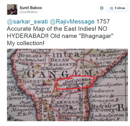 A tweet by Sri Sunil Baboo shows that even in 1757 Maps, Bhagyanagar was not known as Hyderabad. It is therefore clear that the state was called Golkonda and Bhagnagar was a city there.