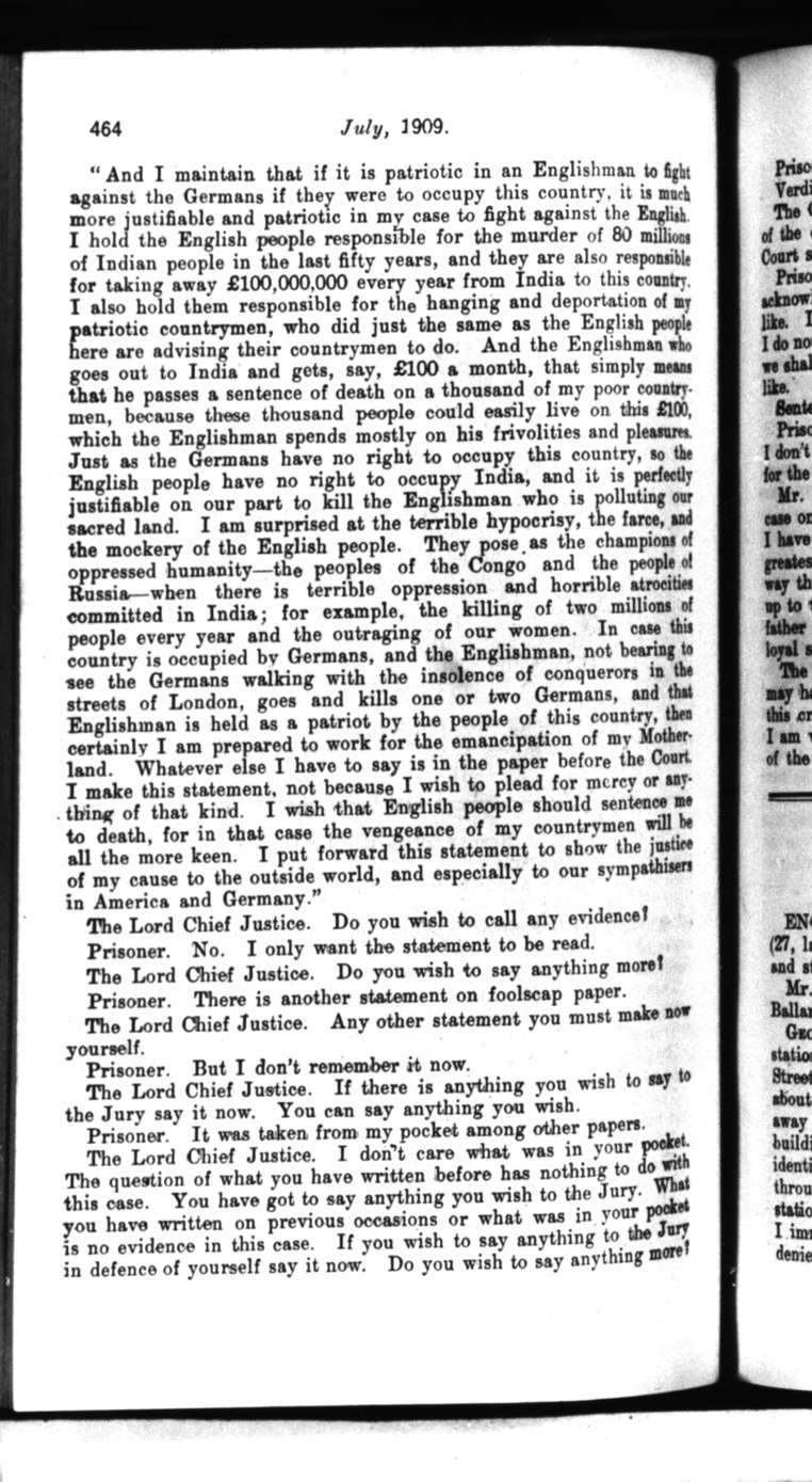 “And I maintain that if it is patriotic in an Englishman to fight against the Germans if they were to occupy this country, it is much more justifiable and patriotic in my case to fight against the English. I hold the English people responsible for the murder of 80 millions of Indian people in the last fifty years, and they are also responsible for taking away ₤100, 000, 000 every year from India to this country. I also hold them responsible for the hanging and deportation of my patriotic countrymen, who did just the same as the English people here are advising their countrymen to do. And the Englishman who goes out to India and gets, say, ₤100 a month, that simply means that he passes a sentence of death on a thousand of my poor countrymen, because these thousand people could easily live on this ₤100, which the Englishman spends mostly on his frivolities and pleasures. Just as the Germans have no right to occupy this country, so the English people have no right to occupy India, and it is perfectly justifiable on our part to kill the Englishman who is polluting our sacred land. I am surprised at the terrible hypocrisy, the farce, and the mockery of the English people. They pose as the champions of oppressed humanity—the peoples of the Congo and the people of Russia—when there is terrible oppression and horrible atrocities committed in India; for example, the killing of two millions of people every year and the outraging of our women. In case this country is occupied by Germans, and the Englishman, not bearing to see the Germans walking with the insolence of conquerors in the streets of London, goes and kills one or two Germans, and that Englishman is held as a patriot by the people of this country, then certainly I am prepared to work for the emancipation of my Motherland. Whatever else I have to say is in the paper before the Court I make this statement, not because I wish to plead for mercy or anything of that kind. I wish that English people should sentence me to death, for in that case the vengeance of my countrymen will be all the more keen. I put forward this statement to show the justice of my cause to the outside world, and especially to our sympathizers in America and Germany.” Original Case Image