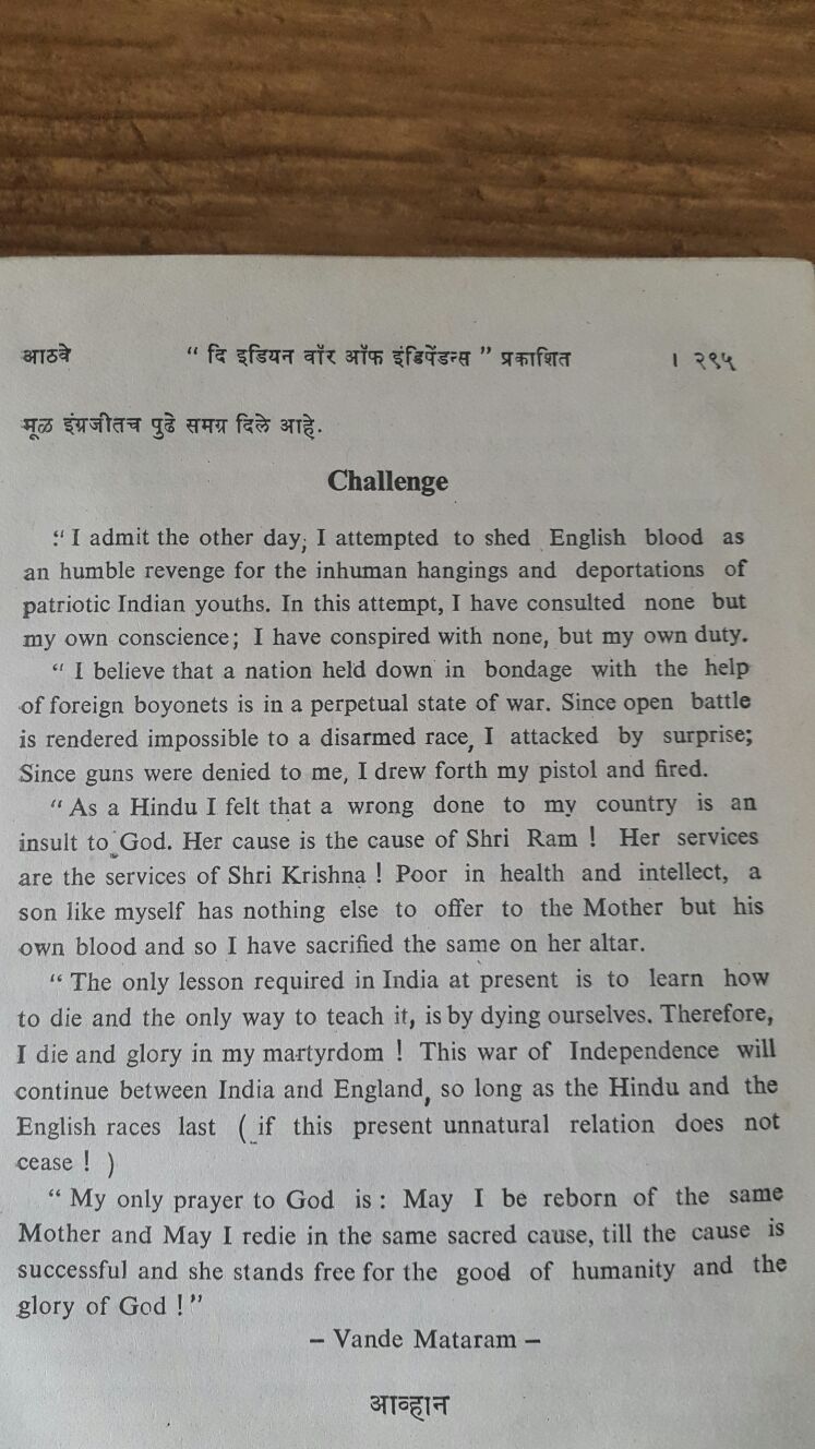 A pamphlet issued by the Indian revolutionaries in London on 17th Aug 1909 titled “The Challenge” by Madanlal Dhingra. The pamphlet was issued as his last words before going to the gallows.