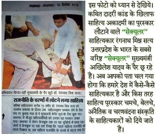 Sahitya Akademi Returnee Ranganath Misra touching feet of Akhilesh Yadav, CM of UP, state in which Dadri Lynching happened.