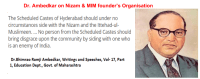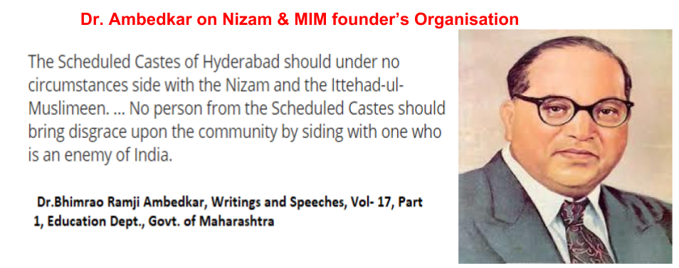 ” हैदराबाद संस्थानामधील अनुसूचित जाती समाजाने कुठल्याही परिस्थितीत निझामाची व इत्तेहाद-उल-मुसलीमीनची बाजू घेऊ नये… अनुसूचित जाती समाजातील कुठल्याही व्यक्तीने देशाच्या दुश्मनांची बाजू घेऊन, अनुसूचित जातिला काळिमा फासू नये.” –डॉ. भीमराव रामजी आंबेडकर, लिखाण आणि भाषणे, खंड-१७, भाग १, शिक्षण विभाग, महाराष्ट्र सरकार.