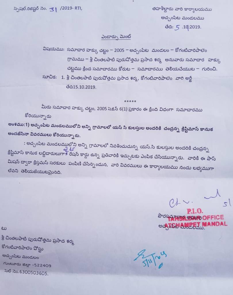 To an RTI query on `selection of beneficiaries’ for the previous government’s scheme ‘Chandranna Christmas Kanuka’ exclusively for Christians, the concerned officials of Achampeta mandal, Guntur District, AP, replies dated 06.09.2019, 26.09.2019 and 05.11.2019 respectively stated that they treated the entire SC population in the aforesaid mandal as Christians and as such they extended the scheme to entire SC population, whereas it should be given only to Christians.(Annexures-1A, 1B & 1C – Attached)