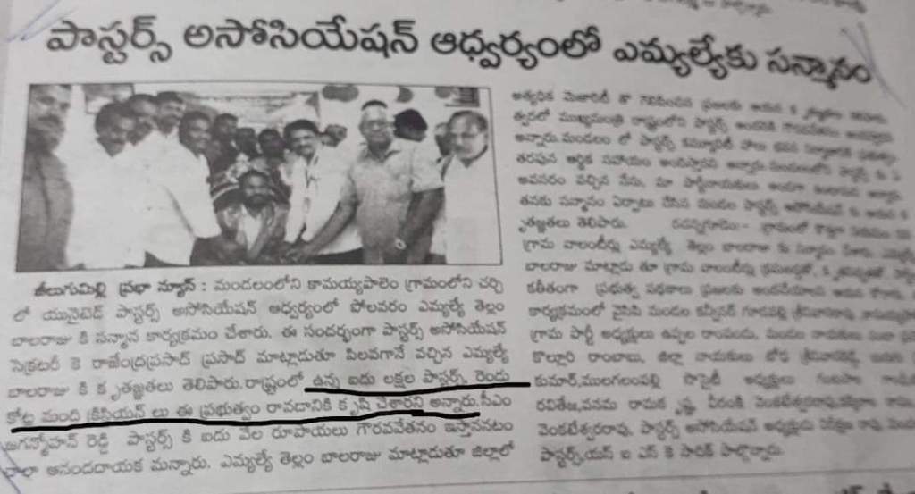 Mr. K. Rajendra Prasad, Secretary for the AP United Pastors Association in a meeting held after the 2019 Assembly Elections in Kaamayyapalem Village, Jeelugumilli (M), West Godavari (District), Andhra Pradesh, giving further proof of large-scale conversions claimed that the Pastors Association has a membership of 5 Lakhs Pastors, and that the state of AP has a total of 2Crores of Christian Population. Whereas the 2011 Census shows the total population of Christians is only 6.82 Lakhs in Undivided Andhra Pradesh. The pastors association felicitated an elected MLA, and the MLA assured that all the pastors would be provided a monthly honorarium by the newly elected AP govt. (Attached News Clip as Annexure-4)