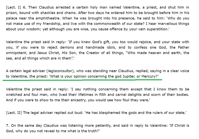 Valentine was abusing Non-Christian Gods and creating communal conflict. He was jailed. Romans wanted to release him provided he toned down. “What is your opinion on (our) Gods Jupiter & Mercury”- they asked. ‘Wretched and foul men.Filthy. Carnal. Of filthy birth’-He answered.