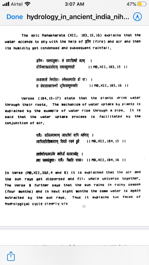 (51. 14-15-16). Similar descriptions of surface and groundwater, hot and cold springs, origins of perennial vs seasonal rivers, weather phenomena, etc. are all described, and Varahamihira’s Vraht Samhita (550 AD) has three chapters devoted to Hydrometeorology.
