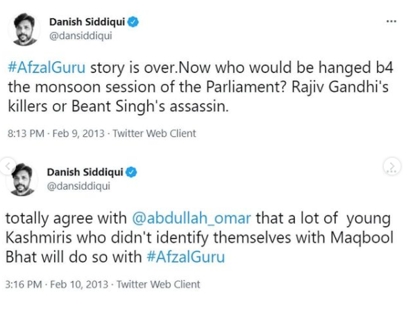 Tweet suggest Danish Siddiqui had soft corner for terrorist Afzal Guru, who masterminded the Parliament attack which killed nine security personnel.