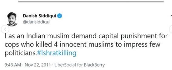He also posted Tweets supporting Ishrat Jahan, even as the convicted terrorist David Headley had implicated Ishrat in terrorist activities in a statement given to the National Investigation Agency (NIA).