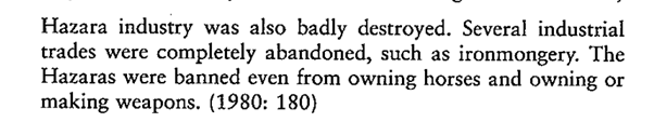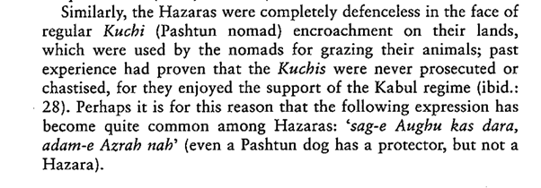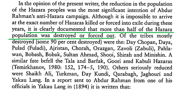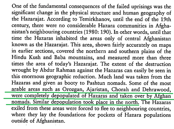 Arable areas of Hazaristan were depopulated of Hazaras and given over to Pashtun nomads.