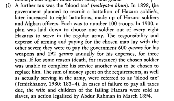 Hazaras were banned from owning houses or weapons. Blo0d tax was imposed on Hazaras.