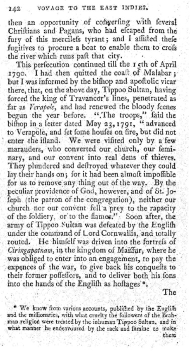 Fr Paulinus has narrated in his book that he got the opportunity to communicate with several Christians and Hindus who escaped from the fury and it’s most probably from them that he came to know in detail about these atrocities. The book was published in Italian language in 1796 and in German language in 1798. An English translation of the book titled ‘A Voyage to the East Indies’ translated by William Johnston in 1800. The book contains graphic details of the savagery unleashed by Tipu on the hapless citizens of Calicut. In addition, Tipu’s own letters to his commanders and officials confirm his actions in executions and forceful conversions into Islam. According to Fr Paulinus: