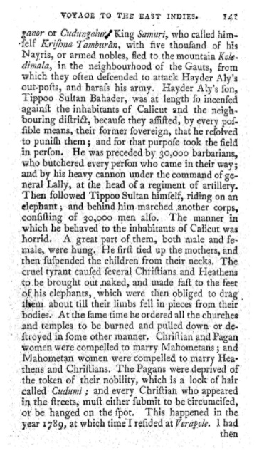 “ Thus, the various murders and acts of treachery, which we see him directing to be carried into execution, were not criminal, but, on the contrary, just, and even meritorious, in his eyes. They might, and most likely did, in a great degree, proceed from a disposition naturally cruel and sanguinary: but, perhaps, an intolerant religious zeal and bigotry were not less active motives to them. The Koran taught him, that it was not necessary to keep faith with infidels, or the enemies of the true religion… With regard to the secret murder of his English prisoners, his dreadful slaughter of the Koorgs and Nairs, and his forcible conversion of so many thousands of the two latter tribes to the Mahommedan faith, he most probably thought such enormities no less warranted, both by the example and precepts of the founder of his religion, than the infraction of oaths and engagements in transactions with unbelievers”