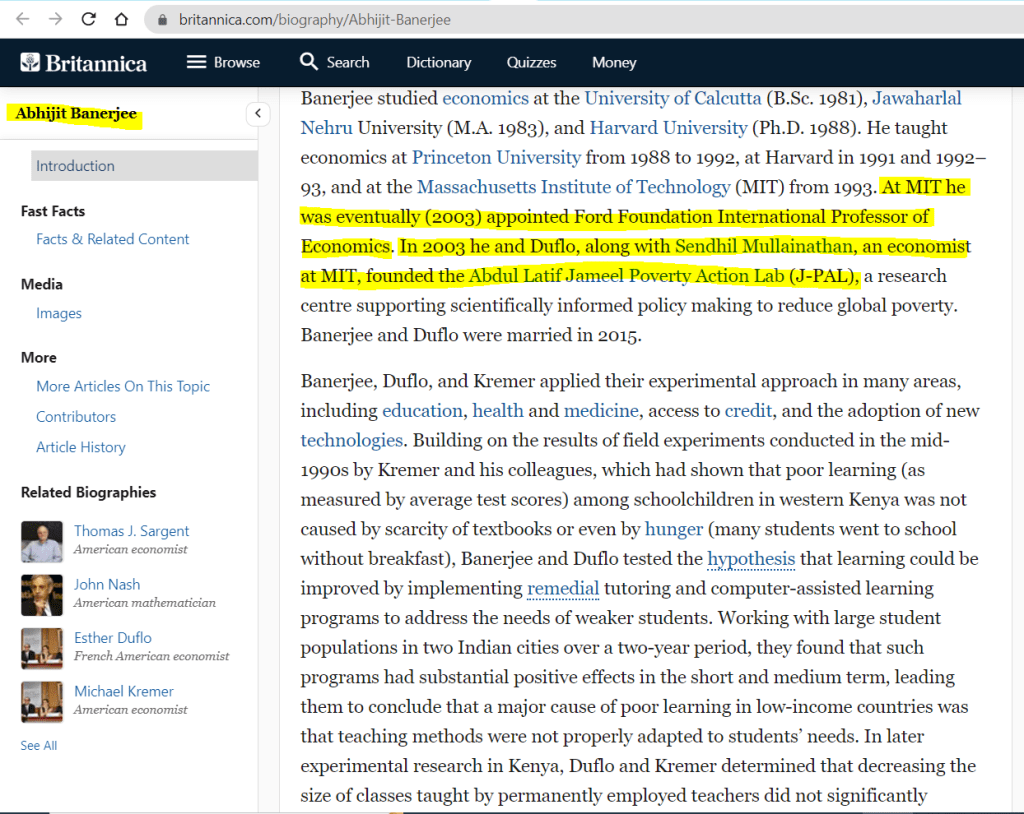 2. In 2003 Abhijit Banerjee was appointed as a ‘Ford Foundation’ International Professor of Economics at MIT. In the same year, he founded the Abdul Latif Jameel Poverty Action Lab (J-PAL).