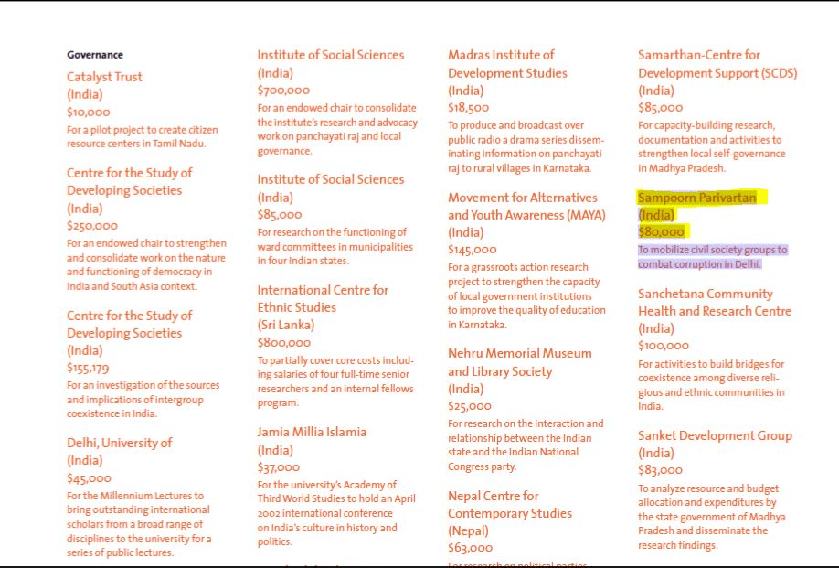 3. Between 2000 to 2010 Kejriwal received direct funding from the Ford Foundation for his NGOs. He has also received the Ashoka fellowship and Magsaysay Award which are also funded by the Ford foundation.