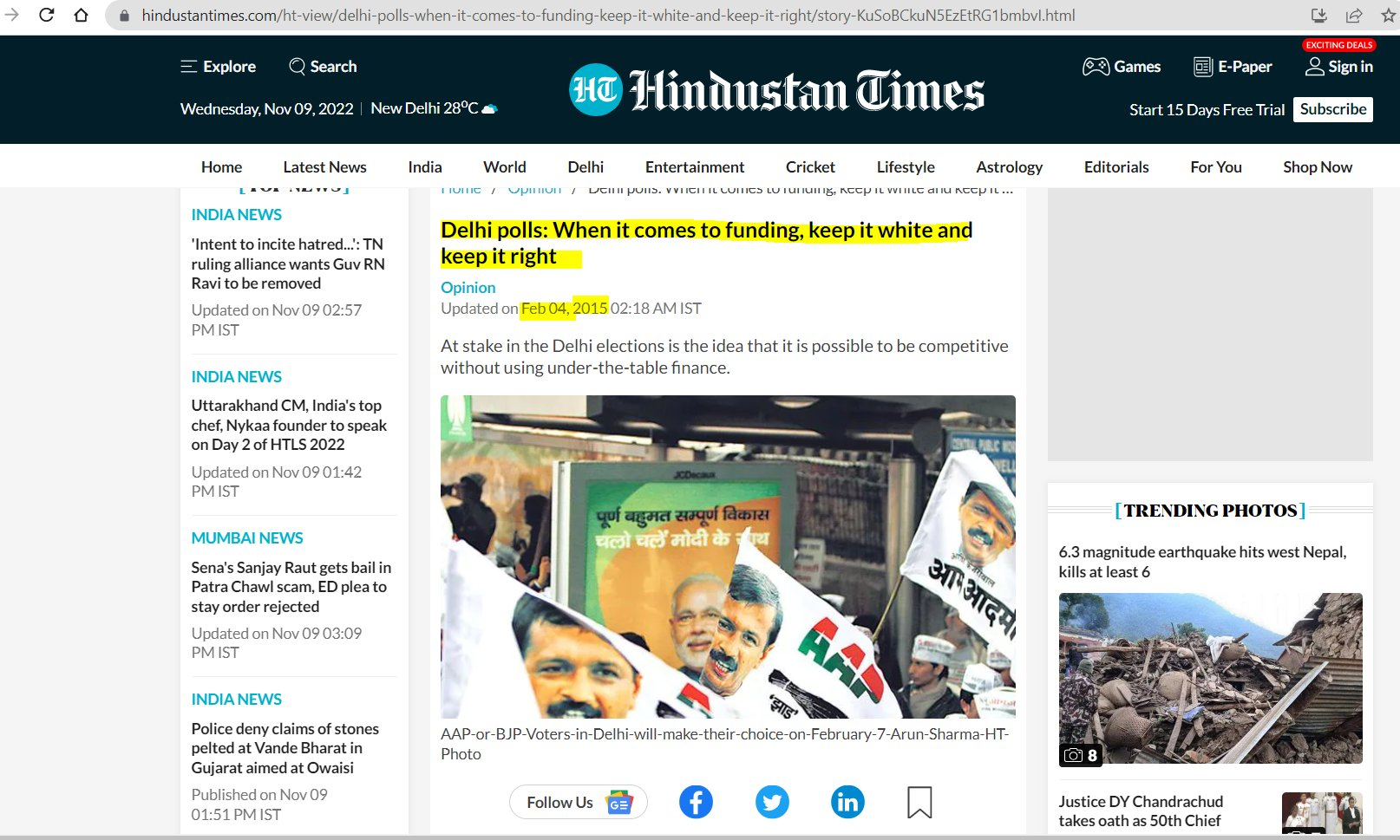 5. In Feb 2015 during the election he wrote an article to support AAP and wrote that “anyone who cares about Indian democracy should be rooting for AAP on February 7”