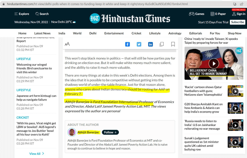 4. In December 2013 Ford Foundation International Professor and founder of Abdul Latif Jameel Poverty Action Lab (J-PAL) started to support and write articles for AAP in media!