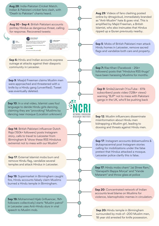 NCRI developed a timeline describing notable events and malicious narratives. Malicious online narratives, many since deleted, played an essential role in instigating attacks in Leicester.