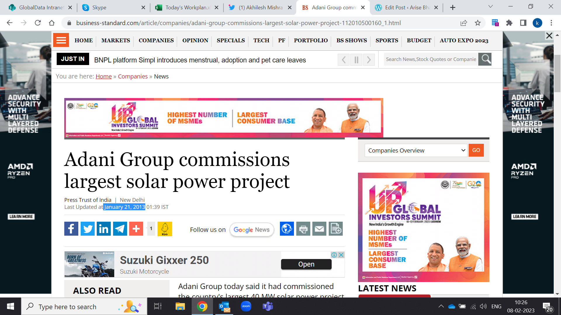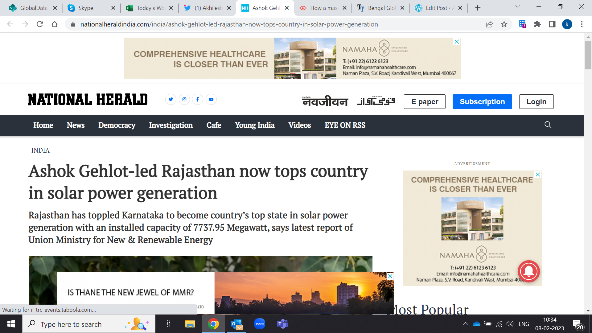 Adani Group in Rajasthan: Congress government leased 1,600 hectares of land across various zones in Rajasthan to Adani Group for 1,500 MW solar park; Another Rs. 50,000 Cr investment for 9,700 MW Hybrid energy park (wind+solar).