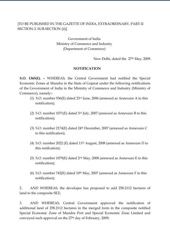 Then came UPA Government under Dr. Manmohan Singh. Between 23rd June 2006 & 11th August 2008, UPA approved six SEZs of Adani group in Mundra. All these 6 approvals were merged into one vide S.O. number 1365 (E) of 27th May 2009 with additional land grant of 258.2112 Ha.