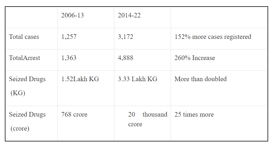 Between 2006 and 2013, authorities confiscated 1.52 lakh kilograms of drugs, and this amount doubled to 3.30 lakh kilograms between 2014 and 2022. The value of the seized drugs also saw a dramatic increase, rising from Rs 768 crore during 2006-2013 to a staggering Rs 20,000 crore between 2014-2022.