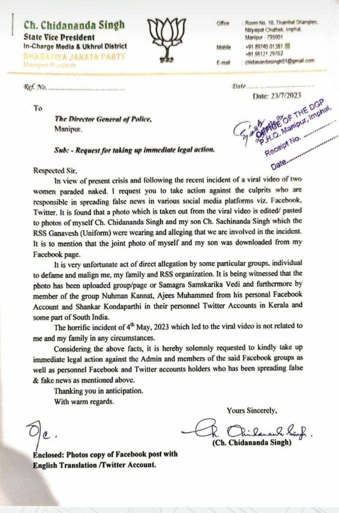 The post gained significant traction, leading the accused individuals, including Ch. Chidananda Singh, the state vice president and in-charge Media & Ukrul District of BJP Manipur, to take legal action against those misusing their personal photo. They filed a case with the Manipur police, who treated the matter as a cybercrime and registered an FIR on 23 July, 2023.