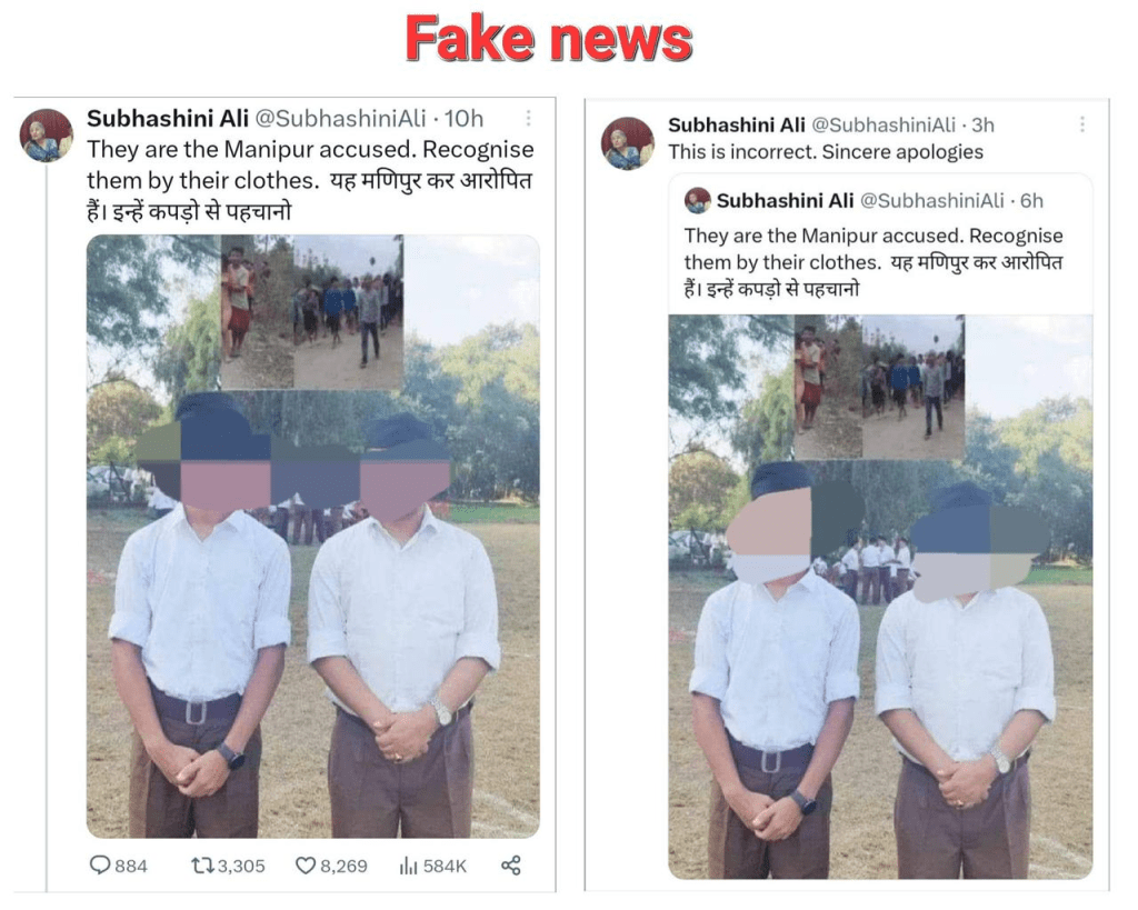 Subhashini Ali, a member of the CPI (M) polit bureau and former LokSabha MP, shared false information on social media by posting a manipulated image, wrongly accusing individuals in the photo of being involved in a case in Manipur where a woman was paraded naked. The individuals in the photo were actually wearing the uniform of Rashtriya Swayamsevak Sangh (RSS). It appears that she shared the morphed image without verifying the details, indicating a deliberate act on her part.