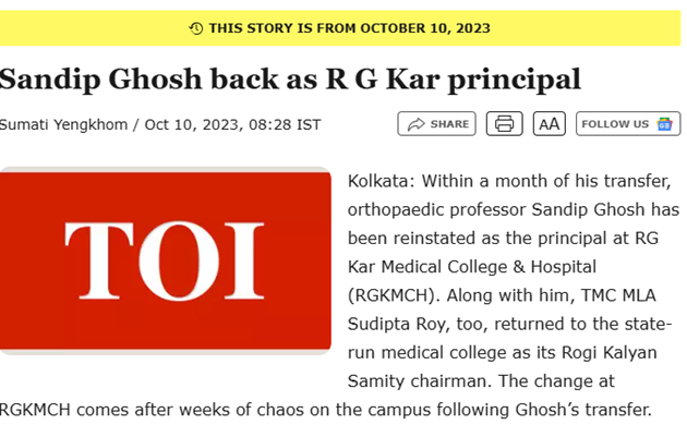 Sandip Ghosh was reinstated as soon as he got transferred, thrice since he was designated as the principal of RG Kar Medical college in 2021.